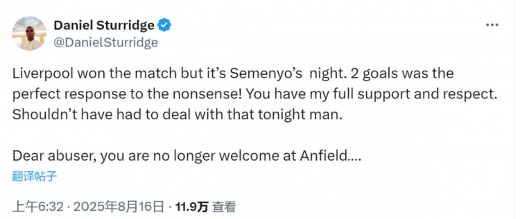 前利物浦球星斯圖里奇在社交媒體上寫(xiě)道:“利物浦贏(yíng)得了比賽,但今晚屬于塞梅諾,兩粒進(jìn)球是對那些荒唐行為的完美回應!我全力支持并尊重你,今晚你本不該經(jīng)歷這樣的事情,伙計?!?/p>