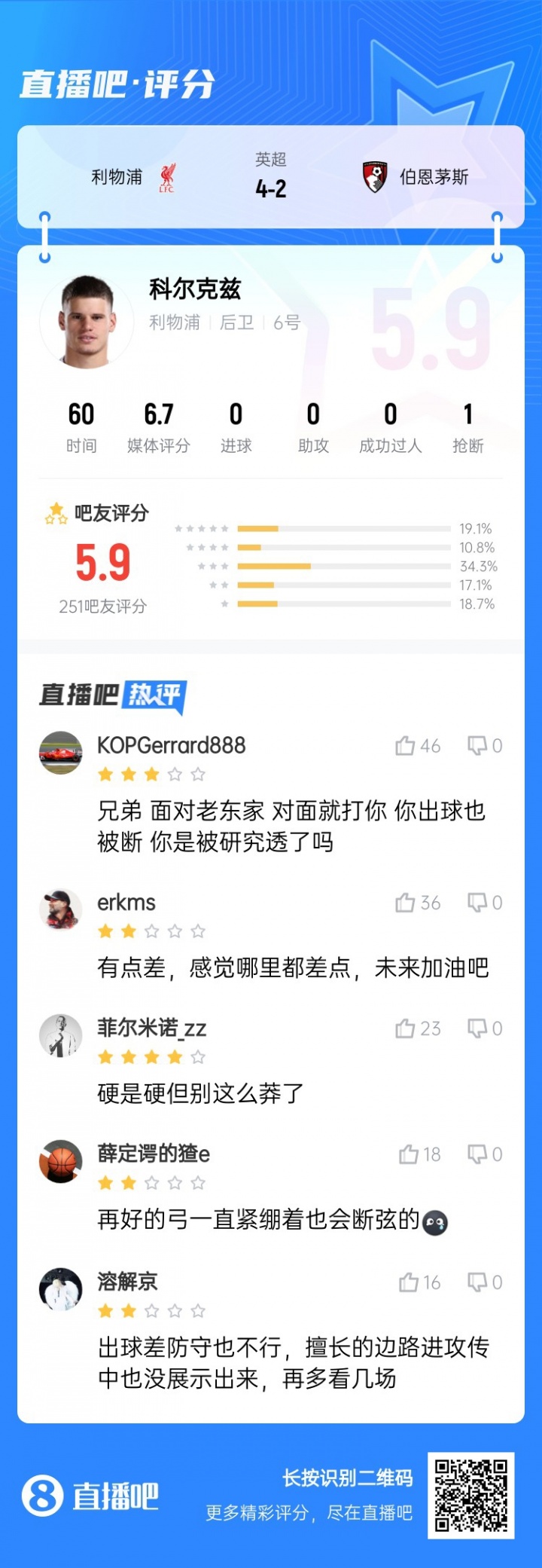 08月16日訊 英超揭幕戰利物浦vs伯恩茅斯,科爾克茲首發(fā)面對舊主,第60分鐘被換下,4次地面對抗2次成功,6次爭頂2次成功,媒體評分6.7、吧友評分5.9分。