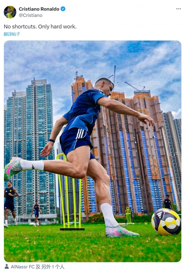 C羅社媒曬出在中國香港訓練的照片,配文:“沒(méi)有捷徑,只有努力?!?/p>
