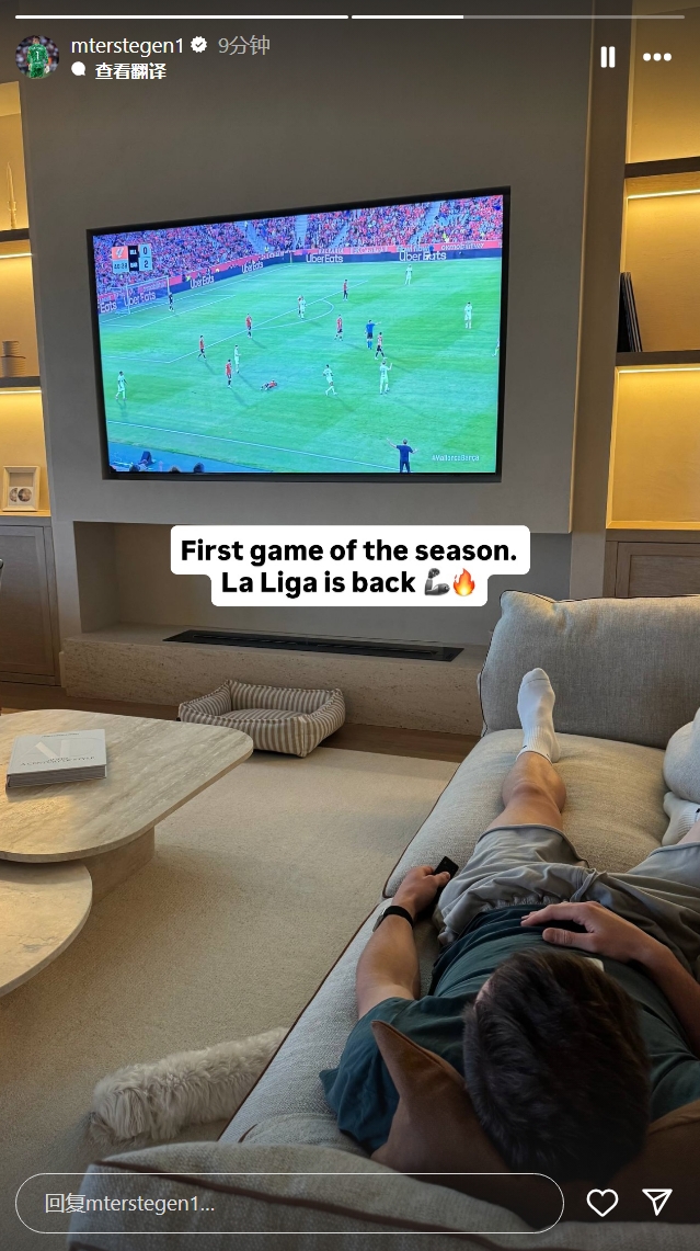 8月17日訊 巴薩門(mén)將特爾施特根更新社媒,曬照在家中觀(guān)看新賽季西甲首輪巴薩對馬洛卡。