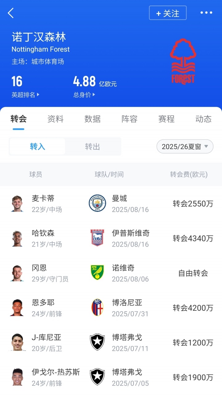 諾丁漢森林今夏引援(總計1.734億歐)↓