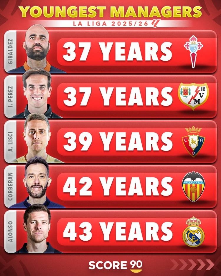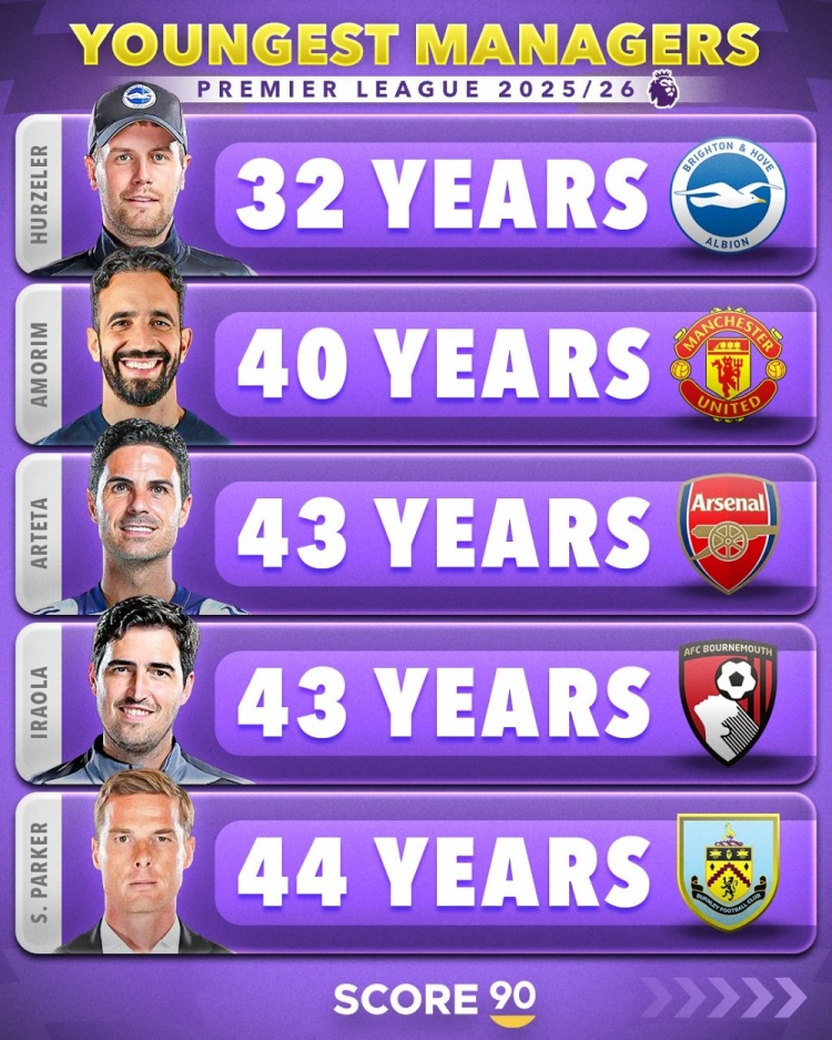 8月17日訊 Score90統計了五大聯(lián)賽球隊在任主帥的年齡,并按照不同的聯(lián)賽列出最年輕主帥排名。