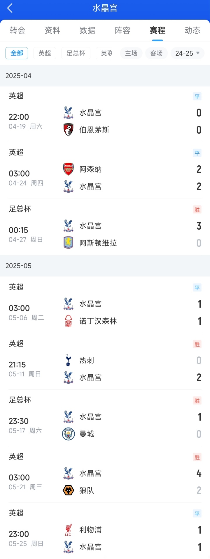 從上賽季英超第33輪0-0戰平伯恩茅斯起,水晶宮已經(jīng)連續10場(chǎng)不敗,其中包括了阿森納、曼城、利物浦、切爾西等諸多強隊,并奪得了足總杯、社區盾兩座冠軍獎杯。