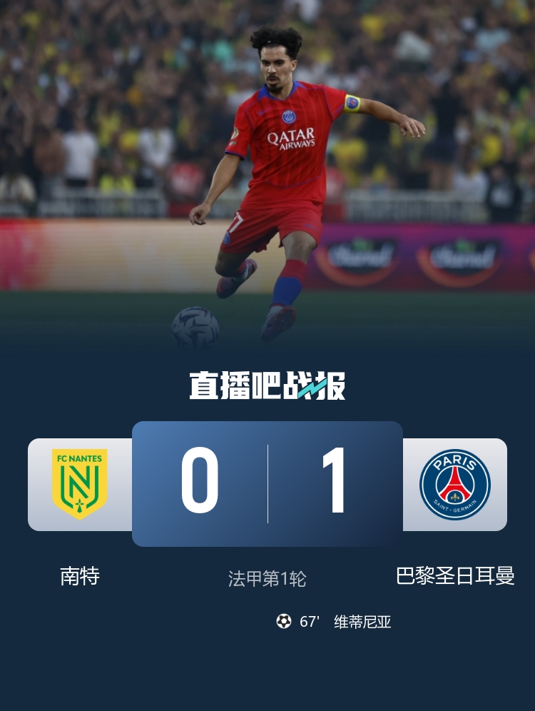 第67分鐘,努諾-門(mén)德斯左邊路分球弧頂,替補登場(chǎng)的維蒂尼亞起腳遠射!皮球變線(xiàn)后飛進(jìn)球門(mén)!巴黎1-0領(lǐng)先南特↓