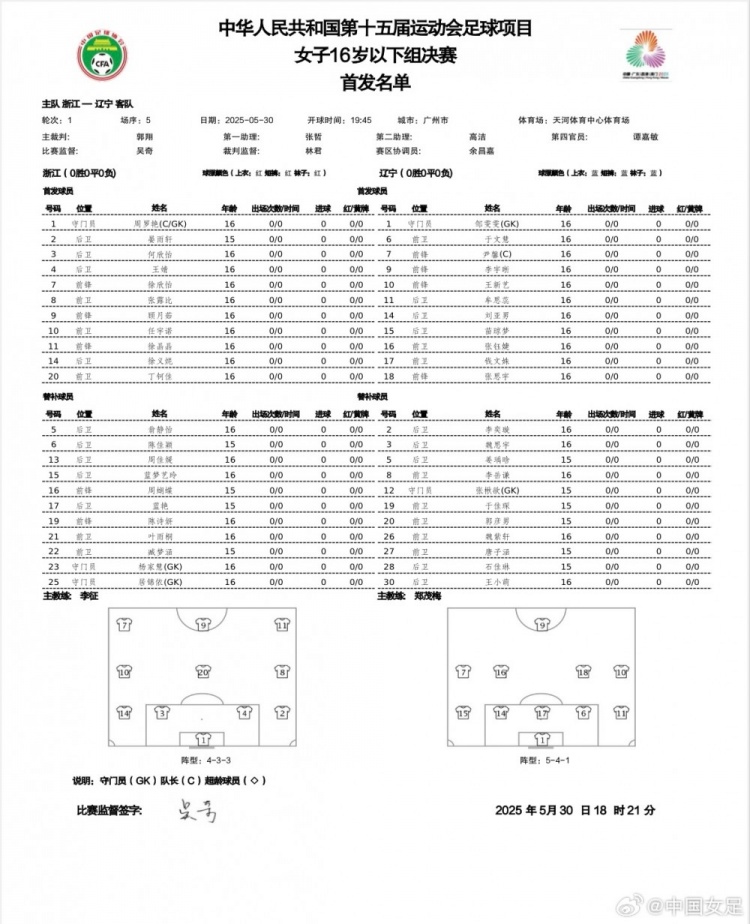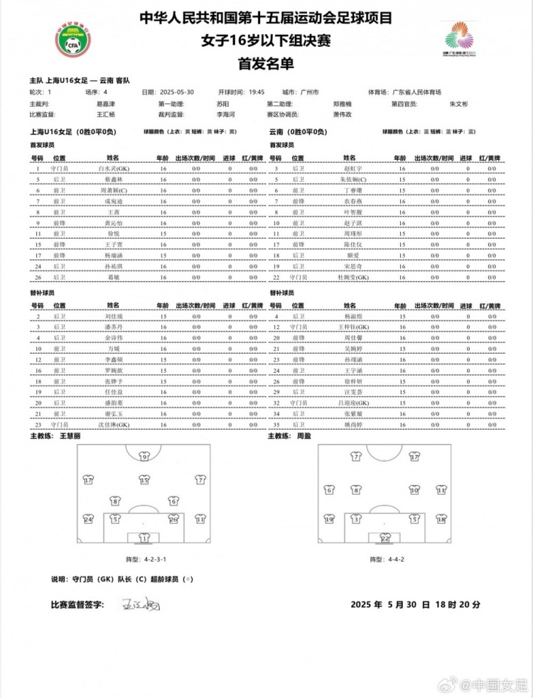 第十五屆全運會(huì )足球項目 女子十六歲以下組決賽首發(fā)名單