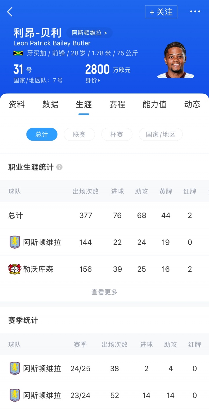 利昂-貝利現年28歲,牙買(mǎi)加籍前鋒。上賽季他為維拉出場(chǎng)38場(chǎng),取得2粒進(jìn)球和4次助攻,目前其德轉身價(jià)為2800萬(wàn)歐。