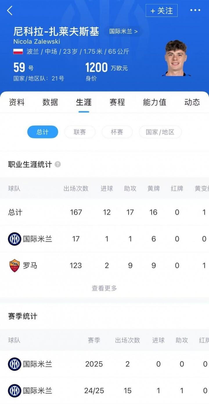 扎萊夫斯基現年23歲,波蘭中場(chǎng),上賽季代表國米各賽事出場(chǎng)15次,貢獻1球1助,目前球員德轉身價(jià)為1200萬(wàn)歐元。