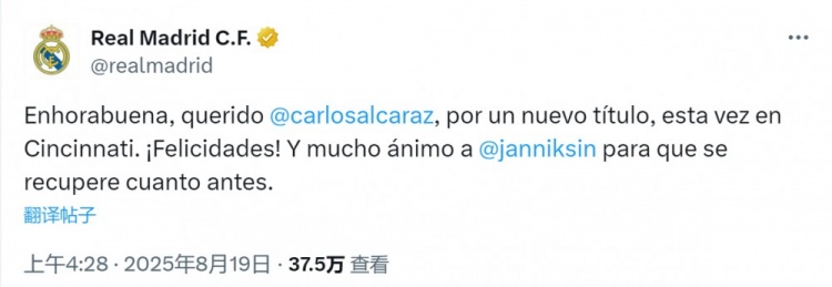 皇馬官方更新社媒動(dòng)態(tài),祝賀阿爾卡拉斯奪冠:“親愛(ài)的阿爾卡拉斯,祝賀你又一次奪冠,這次是在辛辛那提!也祝愿辛納早日康復?!?/p>