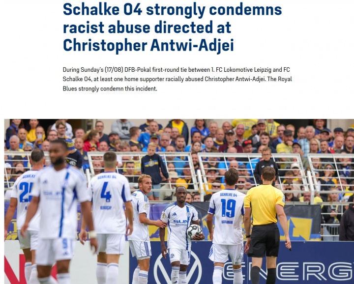 沙爾克董事鮑曼代表董事會(huì )就此發(fā)布聲明表示:“首先,我為克里斯托弗不得不聽(tīng)到這些言語(yǔ)感到非常難過(guò)。我們最強烈地譴責這種行為,并希望能查明肇事者。沙爾克04的球迷和會(huì )員已在我們的章程和使命聲明中明確并毫不含糊地承諾反對歧視和種族主義,作為俱樂(lè )部和董事會(huì ),我們毫無(wú)妥協(xié)地代表這些價(jià)值觀(guān)。我們堅定地站在克里斯托弗一邊?!?/p>