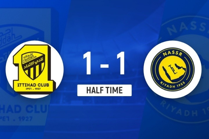 傷停補時(shí)5分鐘。上半場(chǎng)比賽結束,吉達聯(lián)合1-1利雅得勝利。