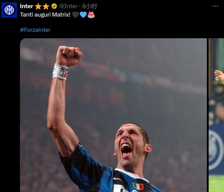 “馬特拉齊于1973年8月19日出生在萊切,今天,他迎來(lái)了自己52歲的生日,國際米蘭俱樂(lè )部以及所有藍黑球迷共同送上最誠摯的祝福?!?/p>
