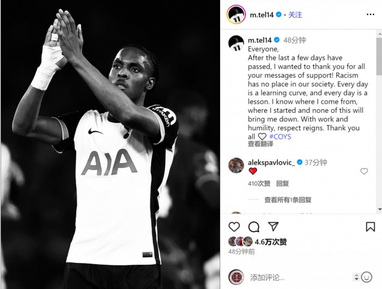 特爾在社交媒體上寫(xiě)道:“大家好,我想感謝你們過(guò)去幾天里的所有支持信息!種族主義在我們社會(huì )中沒(méi)有立足之地。每一天都是一個(gè)學(xué)習的過(guò)程,每一天都是一堂課。我知道自己來(lái)自哪里,從哪里開(kāi)始,這些都不會(huì )讓我退縮。通過(guò)努力和謙遜,尊重將占據主導。感謝大家,加油熱刺!”