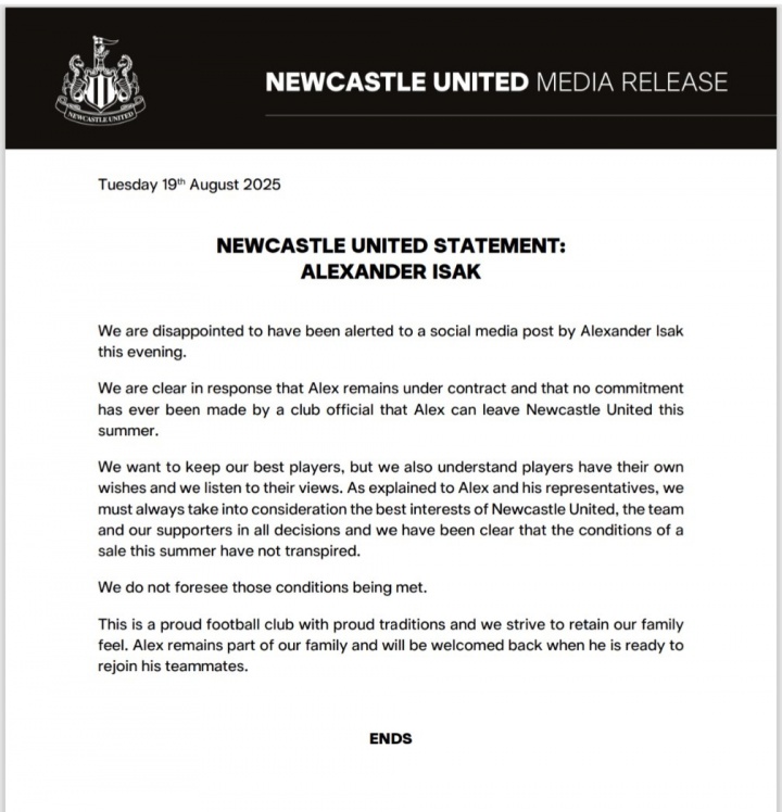 08月20日訊 伊薩克今日在社媒發(fā)文,指責紐卡違背承諾,紐卡斯爾聯(lián)官方剛剛發(fā)文回應,表示從未承諾伊薩克今夏可以離隊。
