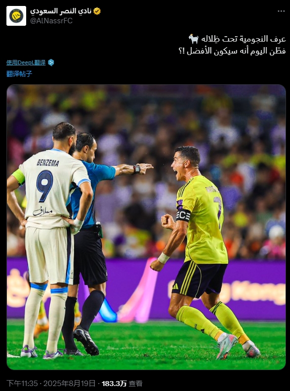 賽后,利雅得勝利官方賬號曬出C羅和本澤馬同框照片,并且配文:他在他的陰影下,知道了球星的特質(zhì)。所以他今天認為自己是最好的?