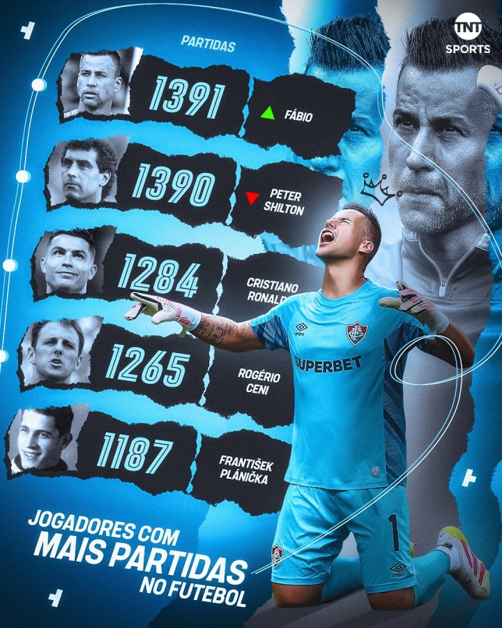 TNT Sports列足壇歷史出場(chǎng)數前五,44歲巴西門(mén)將法比奧居首,40歲C羅目前落后107場(chǎng)排第三,C羅是榜上唯一一名非門(mén)將球員。