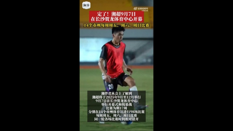 長(cháng)沙發(fā)布報道稱(chēng),湘超將于2025年9月至12月舉行,9月7日在長(cháng)沙賀龍體育場(chǎng)舉行開(kāi)幕式和揭幕戰。比賽為期17周,分別在14個(gè)市州進(jìn)行98場(chǎng)比賽,每周周五、周六、周日比賽,同一輪各場(chǎng)比賽時(shí)間相對錯開(kāi)。