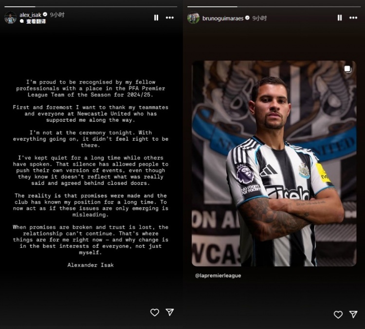 在伊薩克發(fā)文五分鐘之后,吉馬良斯突然曬出一張自己身穿紐卡球衣的定妝照,表情一臉驕傲,這一動(dòng)態(tài)也被認為是在回應伊薩克的言論。