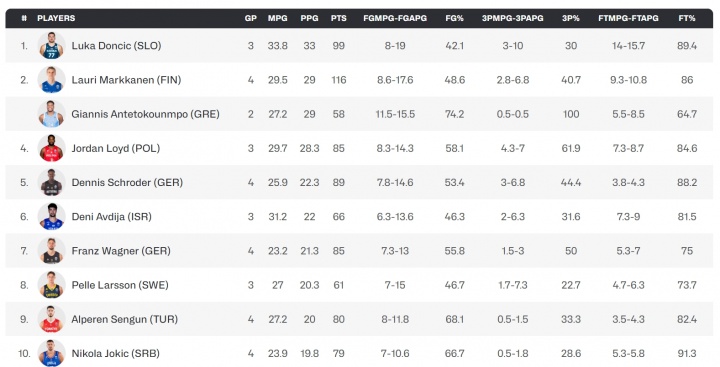 本場(chǎng)之前約基奇場(chǎng)均24.3分10板4.7助,本場(chǎng)比賽之后場(chǎng)均數據來(lái)到19.8分9.3板4.5助,場(chǎng)均得分從場(chǎng)均24.3分掉到了場(chǎng)均19.8分,從歐錦賽第5名跌至第10名。