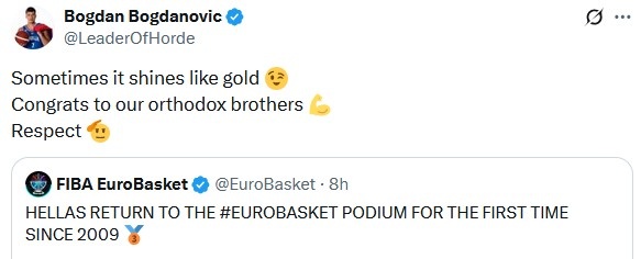 快船球員博格丹-博格達諾維奇發(fā)推祝賀希臘隊:“有時(shí)(銅牌)就像金牌一樣閃閃發(fā)光??