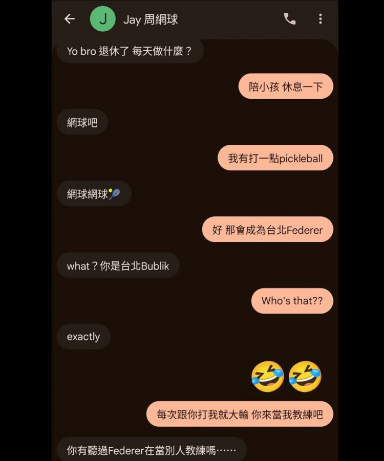 而在聊天截圖中可以看到,周杰倫約書(shū)豪去打網(wǎng)球,書(shū)豪說(shuō):“那會(huì )成為臺北費德勒?!倍芙軅愓{侃到:“你是臺北亞歷山大-布勃利克?!睍?shū)豪還讓周杰倫教他打網(wǎng)球,周杰倫表示:“你聽(tīng)過(guò)費德勒給別人當教練嗎?”