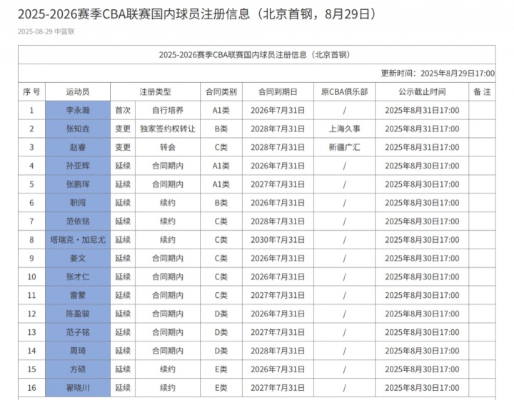 趙睿確定從新疆轉會(huì )至北京簽下3年C類(lèi)合同,張知垚加盟北京,方碩1年E類(lèi)合同續約,翟曉川2年E類(lèi)合同續約,丘天5年C類(lèi)合同續約。