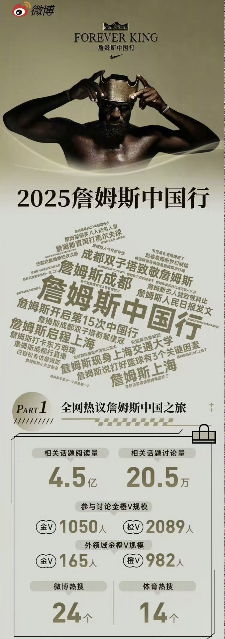 “詹姆斯于2025年9月開(kāi)啟第15次中國行,先后抵達上海和成都,此次中國行以“Forever King”為主題,恰逢其2005年首次中國行20周年。