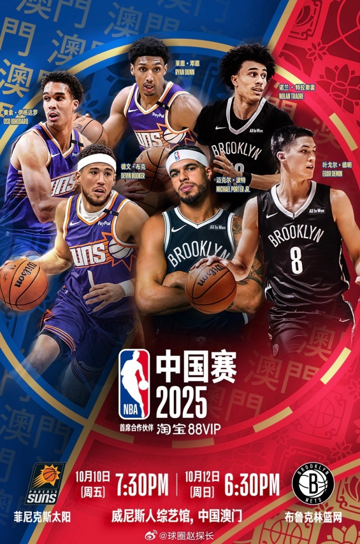 今年NBA中國賽將于10月10日、12日在澳門(mén)開(kāi)打,對陣雙方是籃網(wǎng)和太陽(yáng)。