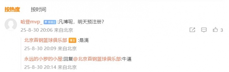 有網(wǎng)友詢(xún)問(wèn)是否明天會(huì )給曾凡博預注冊,北京男籃官博回復:“是滴?!?/p>