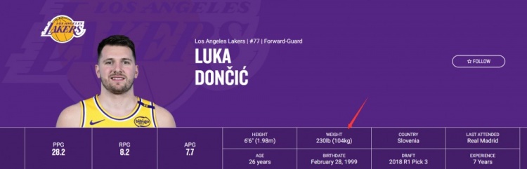 湖人官方公布,目前東契奇的體重為230磅(104.3公斤),去年他的體重最高達270磅??(