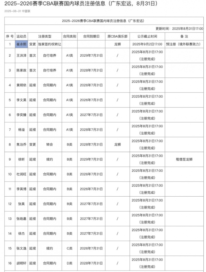 CBA官網(wǎng)今天更新了國內球員注冊信息,廣東為崔永熙完成預注冊。
