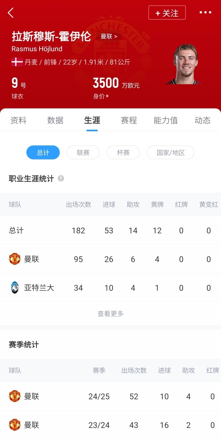 霍伊倫現年22歲,曼聯(lián)2023年夏天花費7780萬(wàn)歐從亞特蘭大引進(jìn)霍伊倫。在曼聯(lián)的兩個(gè)賽季,霍伊倫共代表球隊出戰95場(chǎng)比賽,貢獻26球6助攻。目前,霍伊倫的德轉身價(jià)為3500萬(wàn)歐。