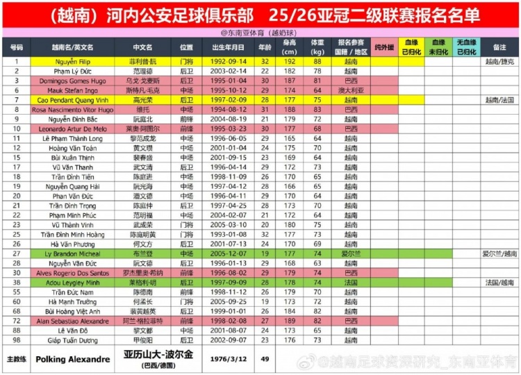 據博主“越南足球資深研究_東南亞體育”在社媒透露,河內公安在本次亞冠二級聯(lián)賽報名了8名外援(8名外援中有2人是血緣球員,由于未完成歸化按外援身份報名),外加兩名血緣歸化球員。此外,包括菲利普-阮、阮庭北、潘文德、武文清等12名越南國腳或邊緣國腳入選。