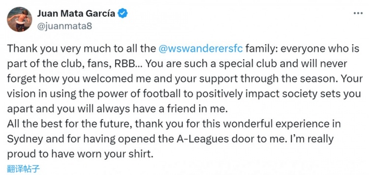 9月16日訊 西班牙中場(chǎng)馬塔合同到期離開(kāi)西悉尼漫步者,他在社交媒體上發(fā)文告別。
