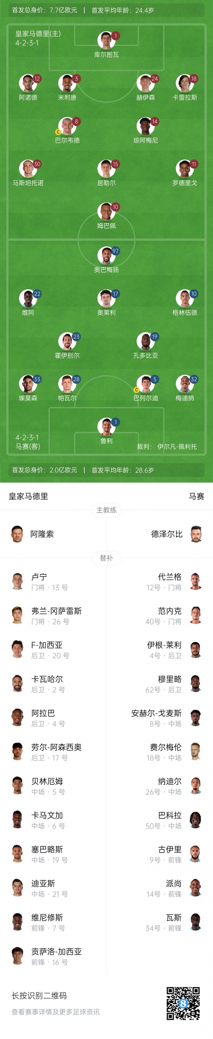 皇馬首發(fā):1-庫爾圖瓦、12-阿諾德、3-米利唐、24-赫伊森、18-卡雷拉斯、8-巴爾韋德、14-瓊阿梅尼、15-居勒爾、30-馬斯坦托諾、11-羅德里戈、10-姆巴佩