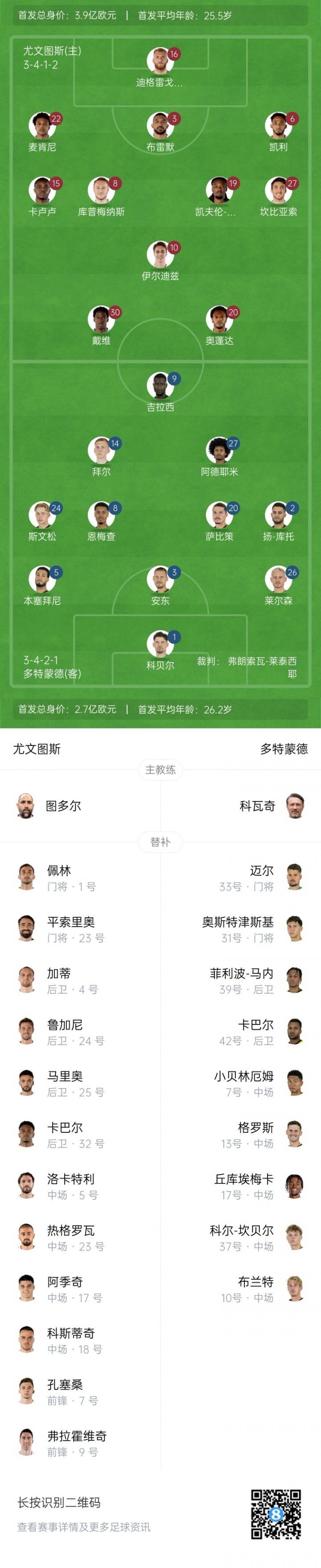 多特蒙德替補:33-邁爾、31-奧斯特津斯基、39-菲利波·馬內、42-卡巴爾、7-小貝林厄姆、13-格羅斯、17-丘庫埃梅卡、37-科爾·坎貝爾、10-布蘭特