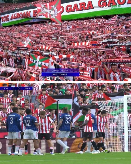 有西班牙記者曬出本場(chǎng)比賽畢爾巴鄂的球迷看臺,可以見(jiàn)到許多支持巴勒斯坦的助威旗幟和橫幅。