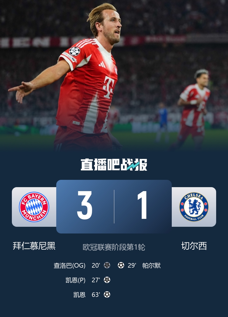 9月18日訊 歐冠聯(lián)賽階段第1輪,拜仁慕尼黑坐鎮主場(chǎng)慕尼黑安聯(lián)球場(chǎng)迎戰切爾西。上半場(chǎng),查洛巴自擺烏龍,凱恩造點(diǎn)+點(diǎn)射,帕爾默破門(mén)。易邊再戰,古斯托失誤送禮,凱恩雙響,帕爾默進(jìn)球被吹。最終拜仁3-1切爾西。積分榜方面,拜仁收獲開(kāi)門(mén)紅積3分,切爾西0分。