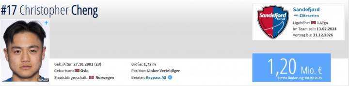 09月19日訊 德轉更新了挪威聯(lián)賽的身價(jià),華裔邊后衛鄭澤彥身價(jià)繼續上漲至120萬(wàn)歐。