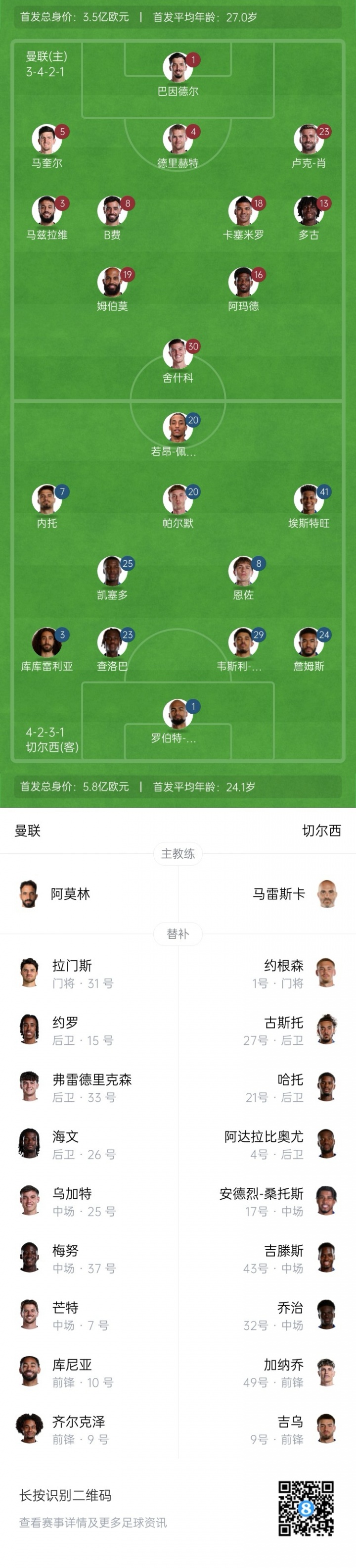 曼聯(lián)首發(fā):1-巴因德?tīng)枴?3-盧克-肖、4-德里赫特、5-馬奎爾、13-多古、3-馬茲拉維、18-卡塞米羅、8-B費、19-姆伯莫、30-舍什科、16-阿瑪德·迪亞洛