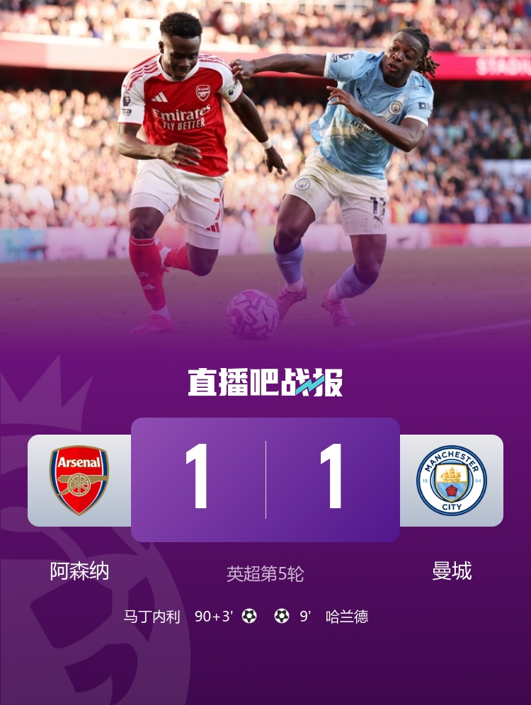 哈蘭德單刀破門(mén)+失良機,馬丁內利補時(shí)吊射建功;阿森納重回第2距榜首5分,曼城近4輪1勝1平2負。