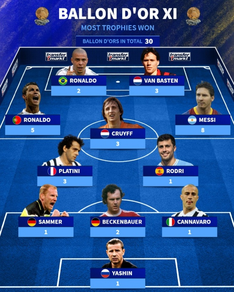 中場(chǎng):普拉蒂尼(3次)、克魯伊夫(3次)、羅德里(1次)