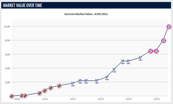 奧利塞在拜仁的首賽季55場(chǎng)各項賽事,打進(jìn)20球并送出23次助攻。球員德轉身價(jià)暴漲4500萬(wàn)歐,現在身價(jià)為1億歐。