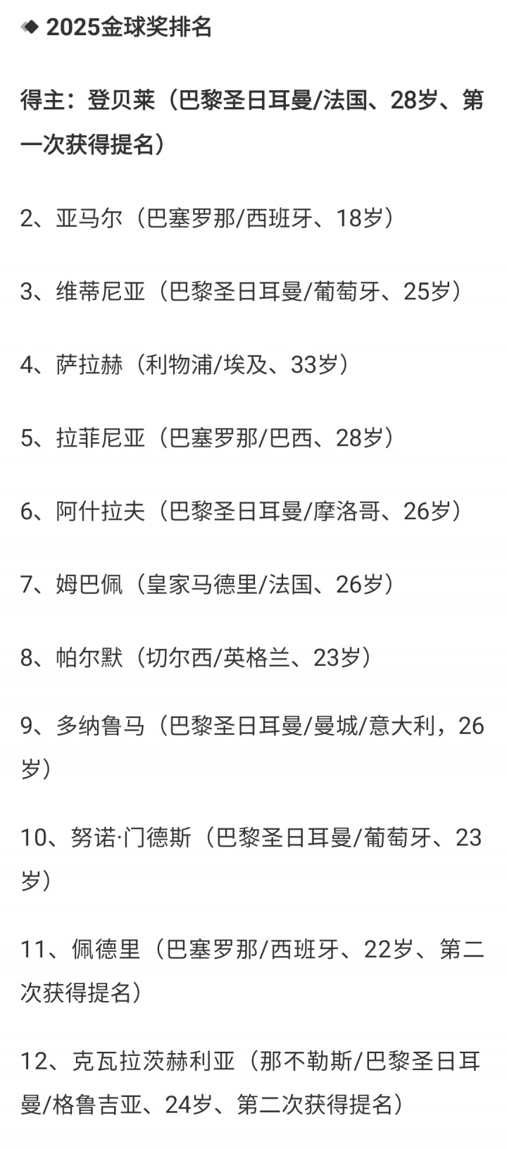 駱明表示:恭喜登貝萊獲得金球獎。不過(guò)我的選票還不能公布,因為《法國足球》雜志今年特地要求,具體選票不能先于他們公布。我只能暗示一下,我的選票前五與最后前五(下圖)人選一致,有三人順序也一樣,只有兩個(gè)人順序差了一位。您大概可以猜到我的選票了。 ???