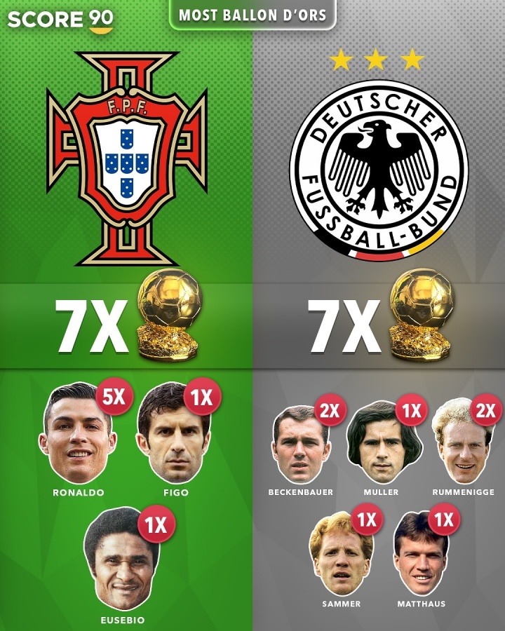 1.法國 8次(普拉蒂尼x3 本澤馬、齊達內、帕潘、科帕、登貝萊x1)