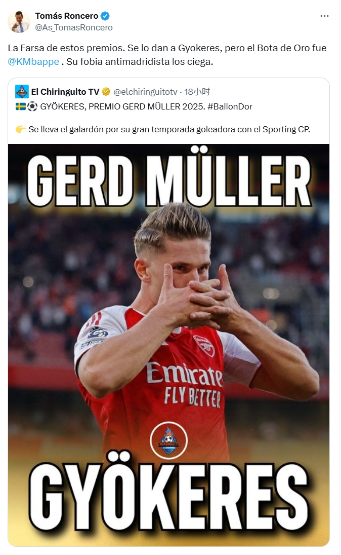 龍賽羅在自己的一條社媒中寫(xiě)道:“這些獎項簡(jiǎn)直是鬧劇。他們把這項獎(蓋德-穆勒獎)頒給了約克雷斯,(歐洲)金靴獎卻頒給了姆巴佩。他們的反皇馬恐懼癥蒙蔽了他們的雙眼。”