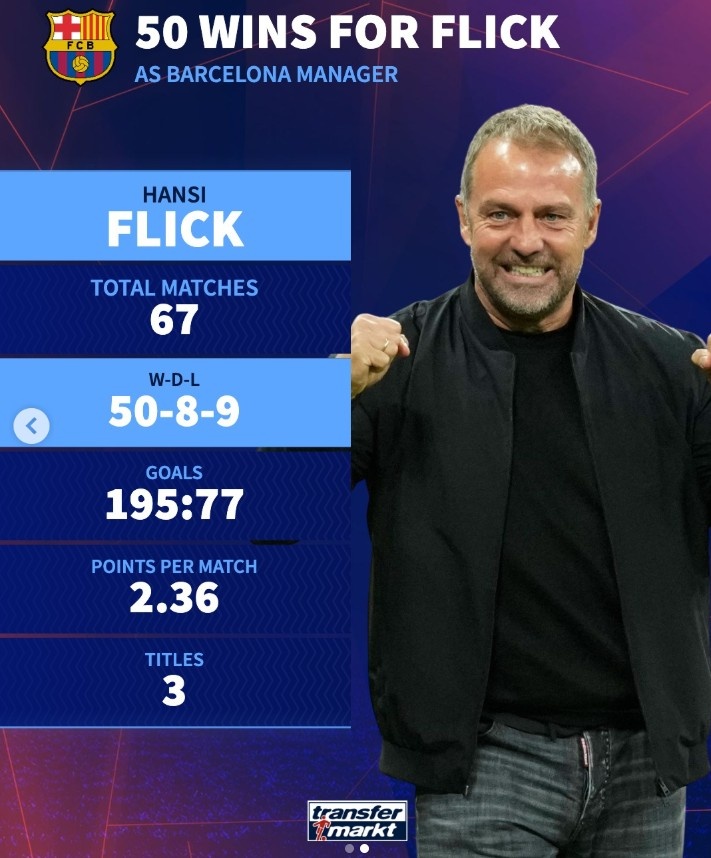 9月26日訊 巴薩本輪3-1擊敗奧維耶多,根據德轉統計,弗里克實(shí)現巴薩50勝里程碑。