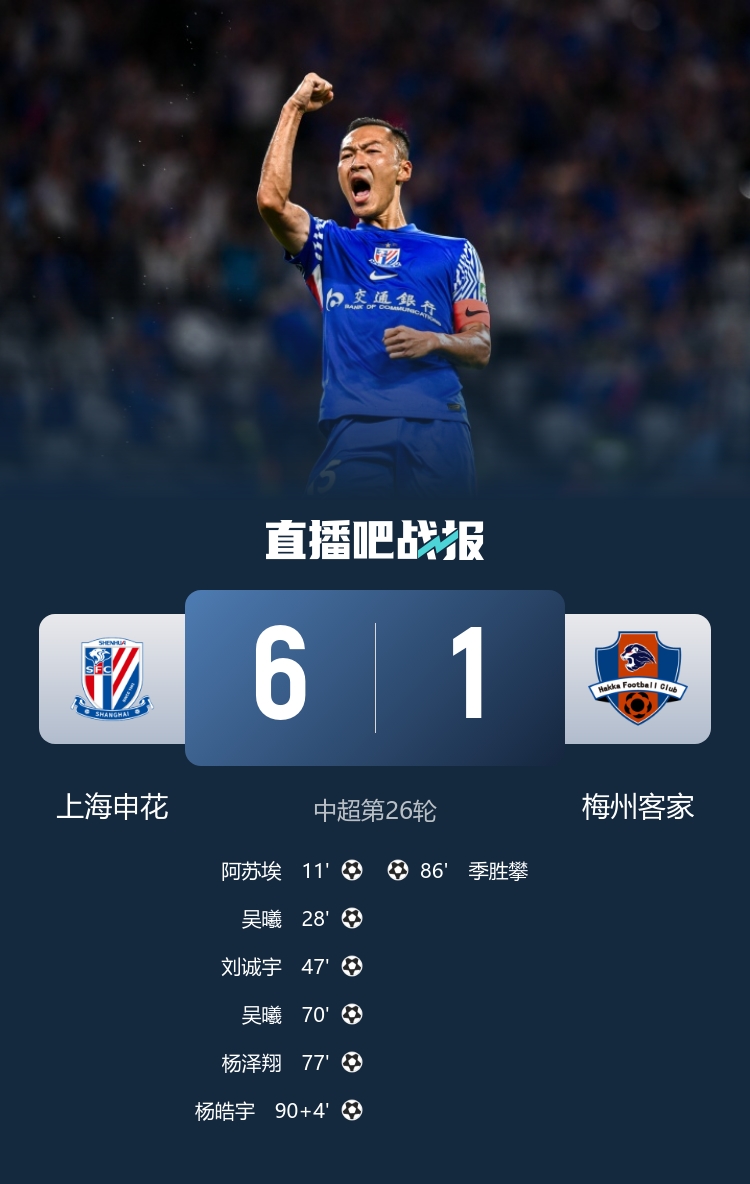 下半場(chǎng)補時(shí)7分鐘。最終全場(chǎng)比賽結束,上海申花6-1梅州客家。