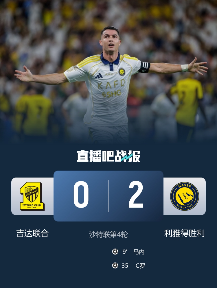 9月27日訊 沙特聯(lián)第4輪,吉達聯(lián)合坐鎮主場(chǎng)迎戰阿卜杜拉國王體育場(chǎng)迎戰利雅得勝利。上半場(chǎng),馬內傳射,C羅頭槌破門(mén)生涯第946球!易邊再戰,C羅錯失空門(mén)良機。最終利雅得勝利2-0客勝吉達聯(lián)合。積分榜方面,勝利4連勝領(lǐng)跑,吉達聯(lián)合9分第二。