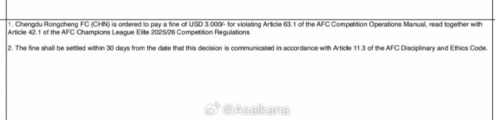 亞足聯(lián)紀律委員會(huì )對成都蓉城處以罰款3000美元的罰款。原因為在今年亞冠精英聯(lián)賽附加賽的比賽中未能按時(shí)清空體育場(chǎng)的商業(yè)標識。根據亞冠精英聯(lián)賽規程和亞足聯(lián)賽事操作手冊規定,承辦賽區必須在賽前2天將體育場(chǎng)范圍內未經(jīng)亞足聯(lián)授權的商業(yè)標識進(jìn)行清理、移除、遮擋,以確保亞足聯(lián)及其賽事贊助商的商業(yè)權利,如未能在規定時(shí)間內交付清理后的體育場(chǎng),則會(huì )被亞足聯(lián)實(shí)施罰款處罰。
