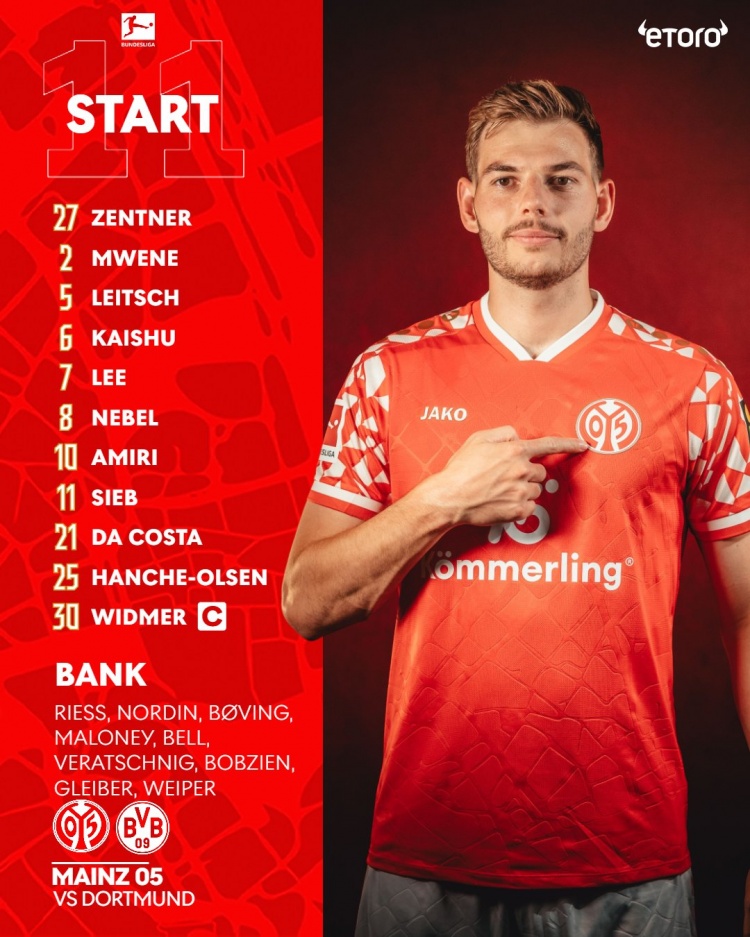 27-岑特納、2-姆維尼、5-萊特施、6-佐野海舟、7-李在城、8-內布爾、10-阿米里、11-西耶布、21-達科斯塔、25-奧爾森、30-威德默